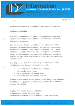 Die FZV-Information 2/82 faßt die Ergebnisse einer empirischen Vorstudie zum beruflichen Belastungserleben des Zahnarztes zusammen.